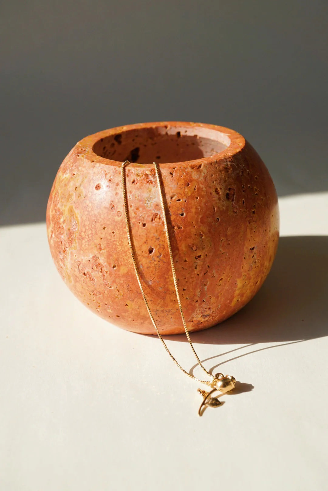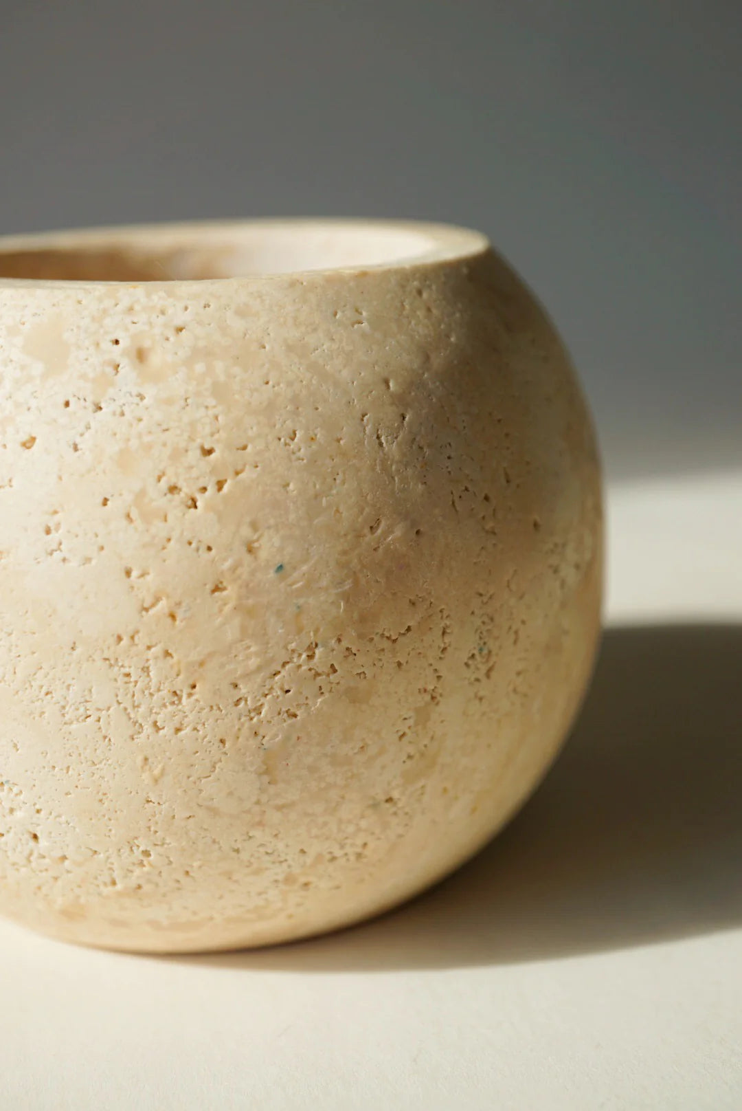 A boule shaped natural stone vessel that serves as both decor and storage.