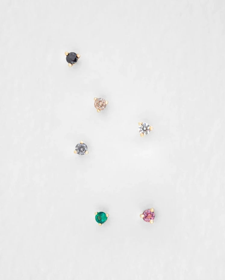 The perfect stud. Solid 14k yellow gold with a brilliant cut round pink tourmaline stone in a minimal three-claw setting.