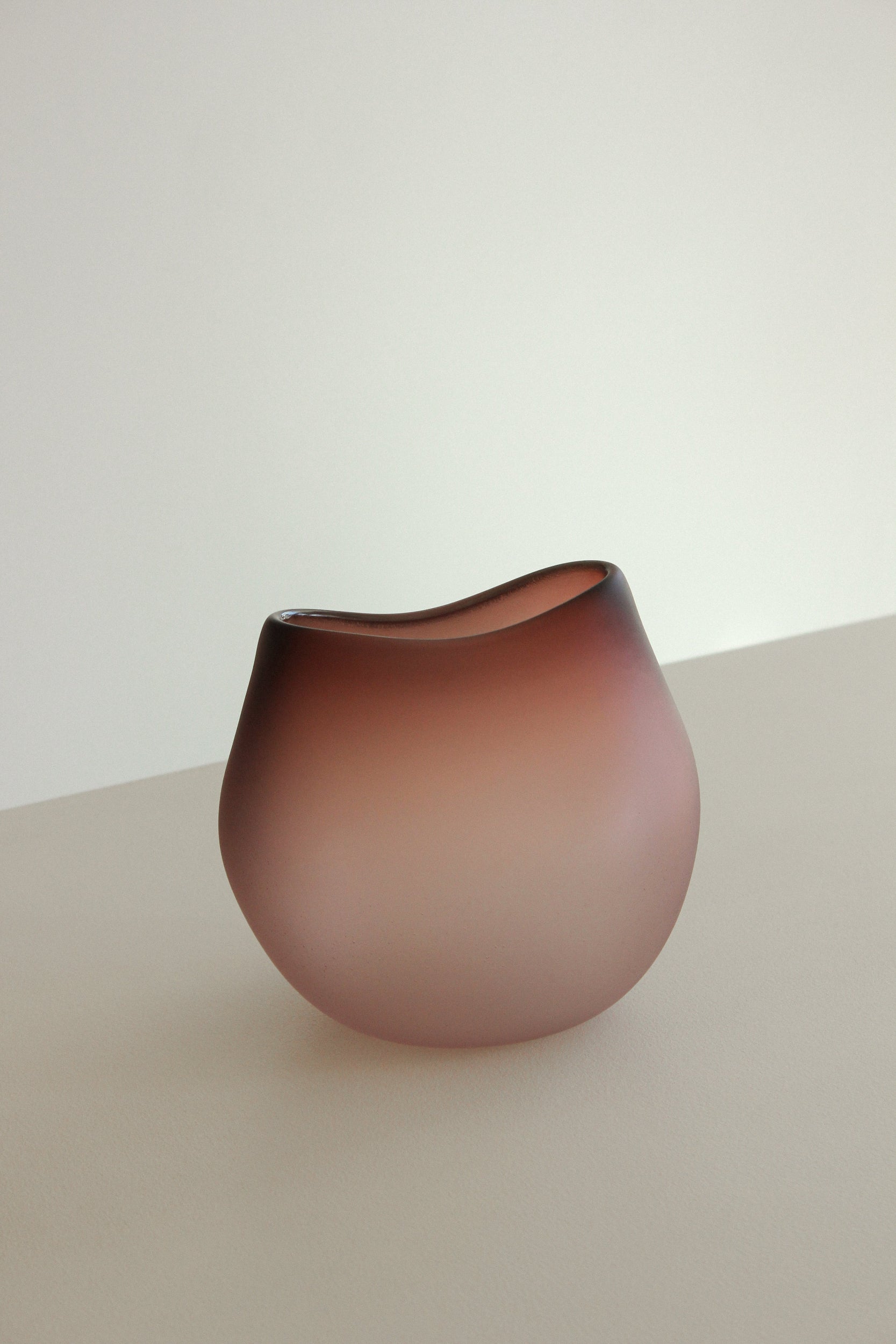 A fluid form in sandblasted glass. The pinched opening adds visual interest and allows foliage to be held securely in place.
