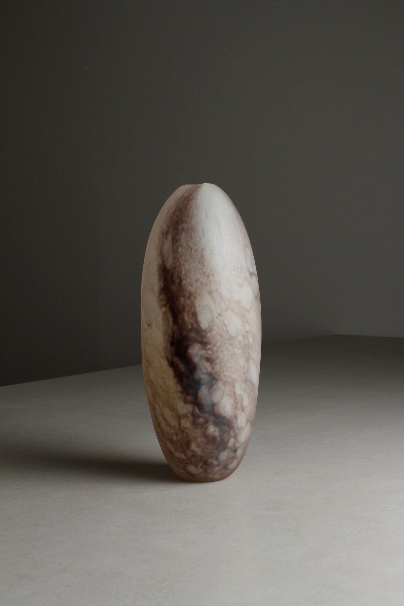 Hand blown glass vase in a signature matte sandblasted finish. Variegated bubble-like appearance in shades of plum, mauve and grey.