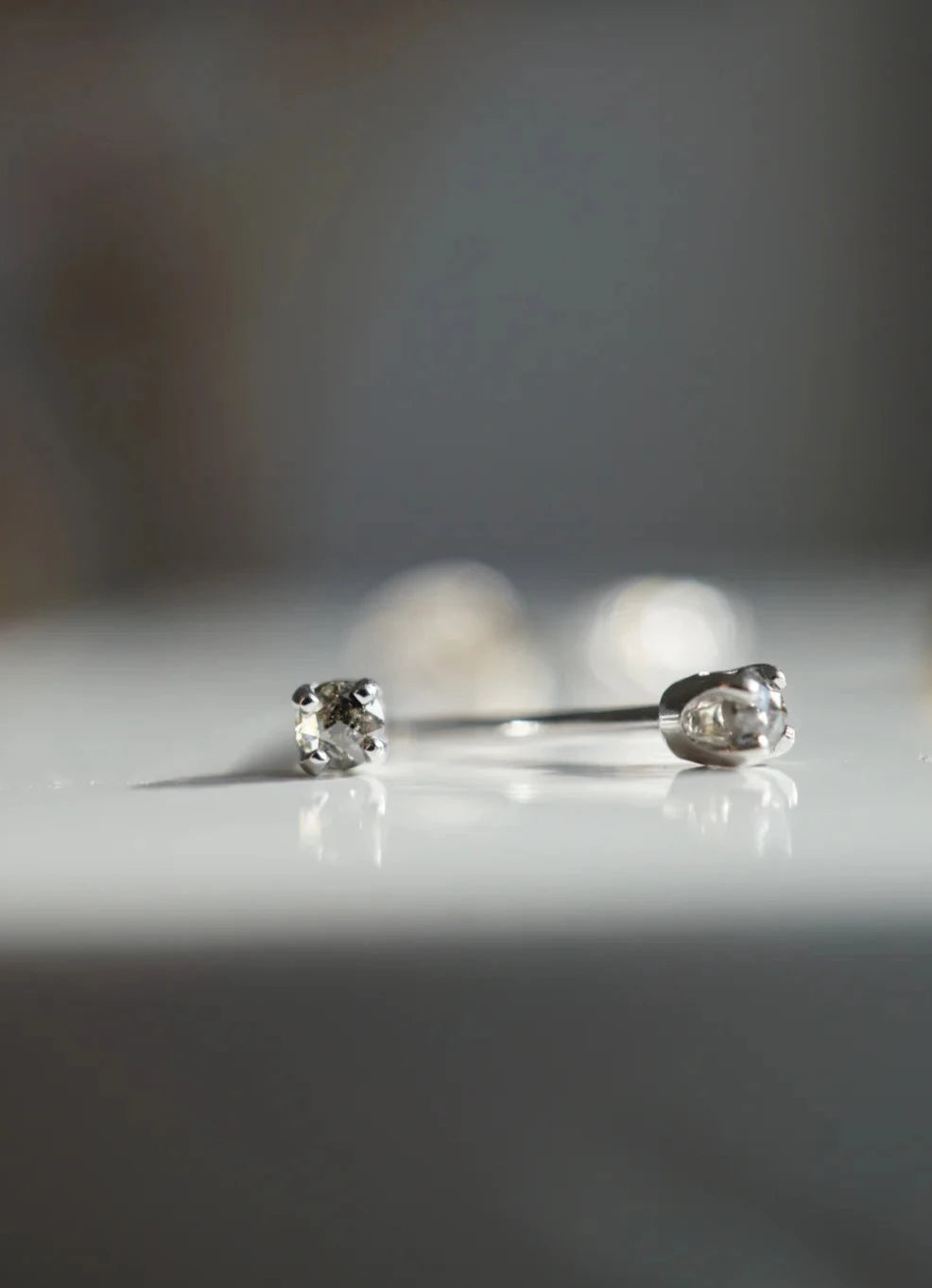 Subtle sparkle - tiny studs with grey tone salt and pepper round brilliant cut diamonds in solid white gold.
