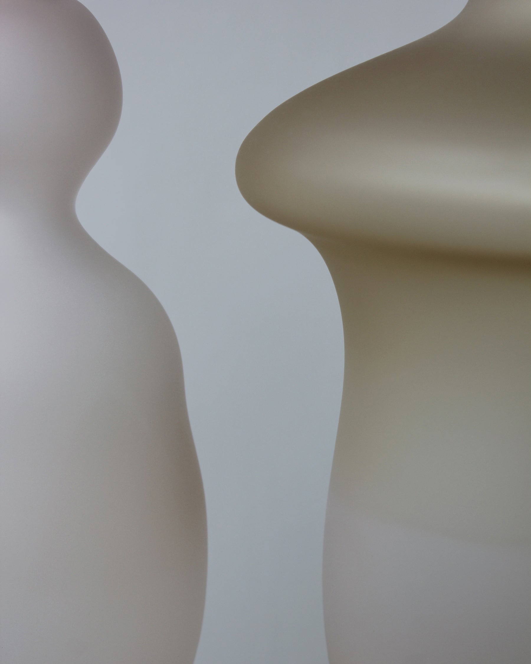 A modern, elegant piece to suit a multitude of spaces. A signature sandblasted finish with a sunset gradation from the palest blush to sandy tan. Handblown and one of a kind.