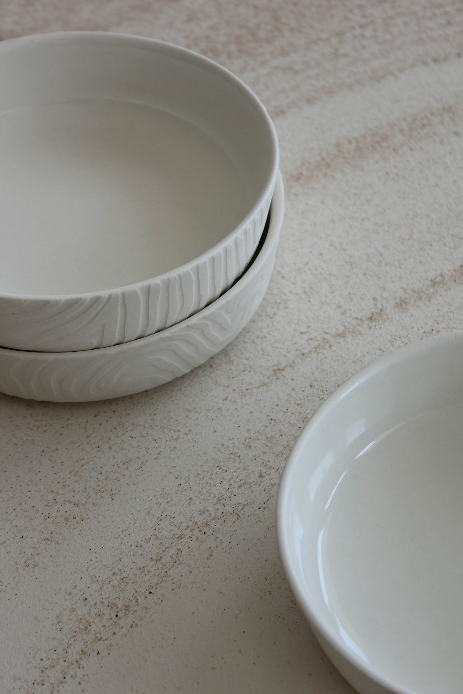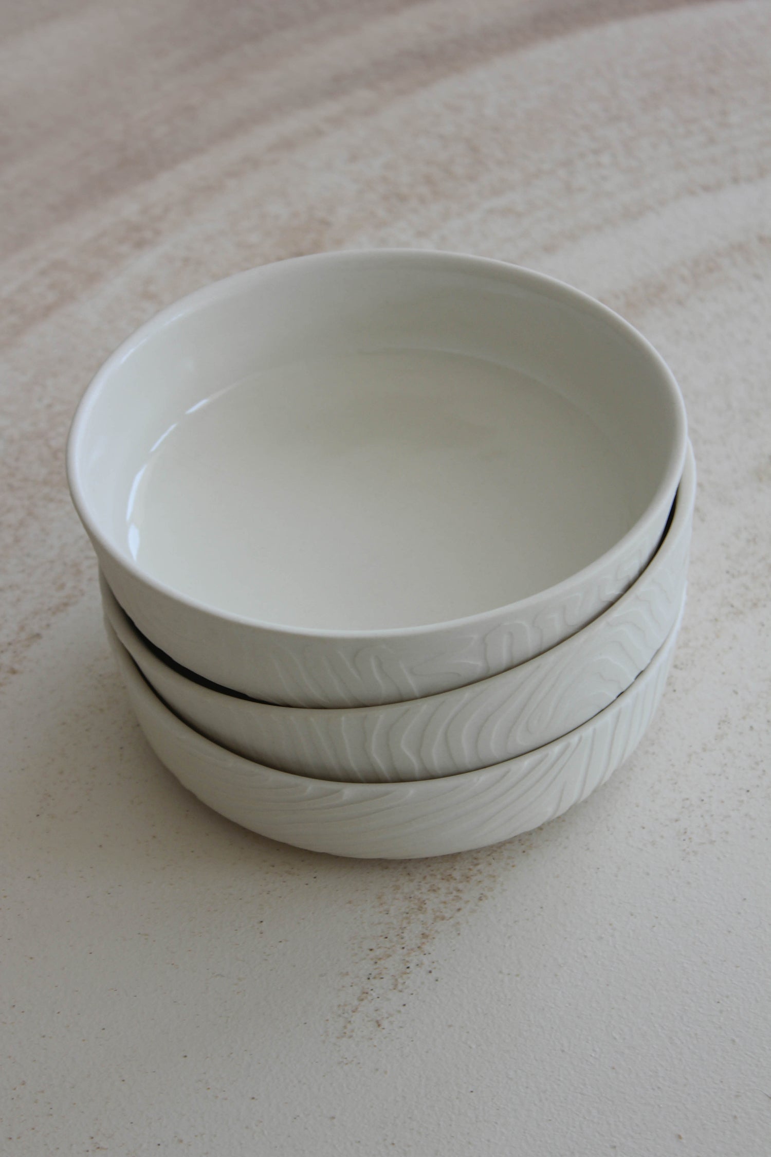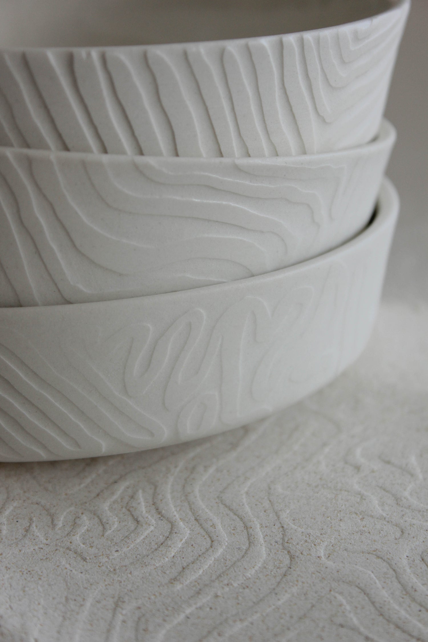 With a subtle relief reminiscent of drawing in the sand, each bowl is individually hand carved by the artist. Equally suited for serving or storage.