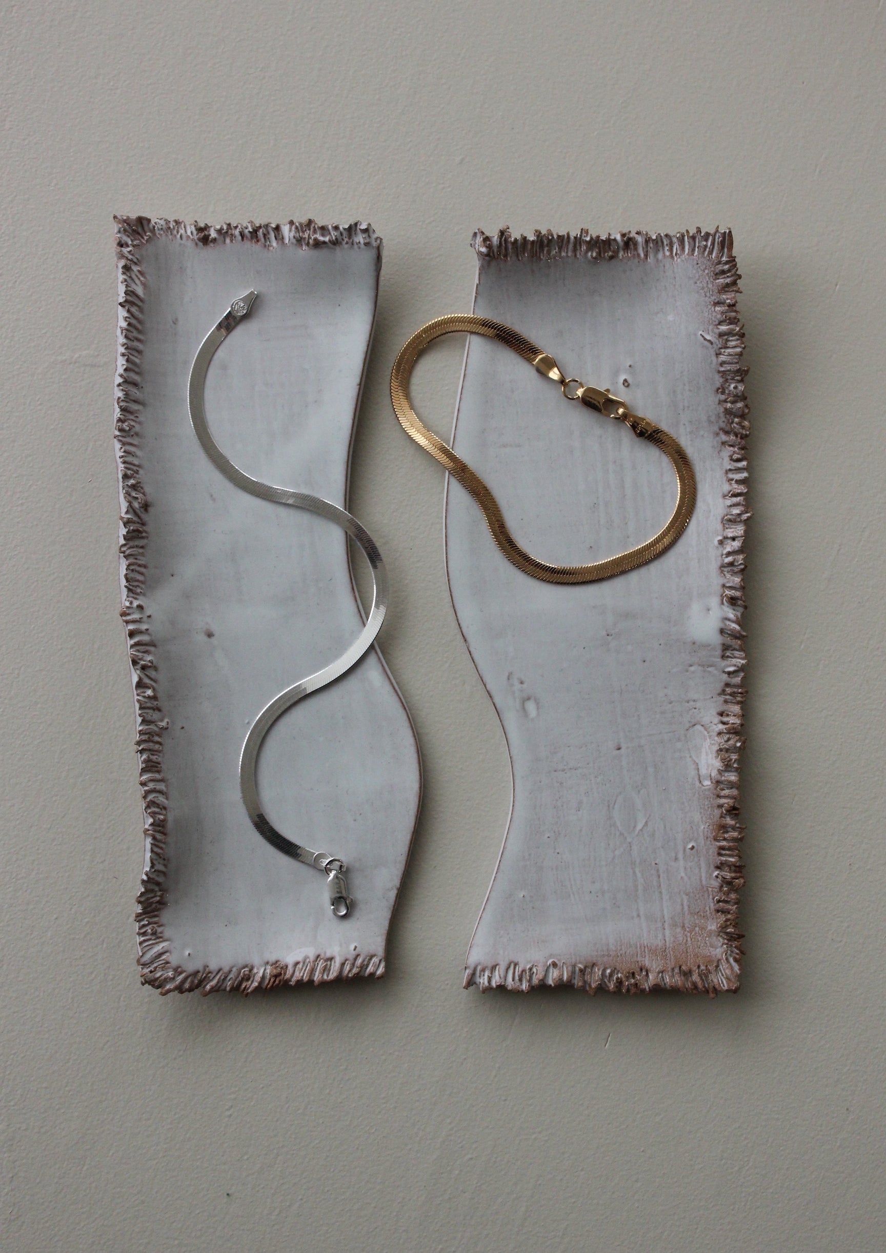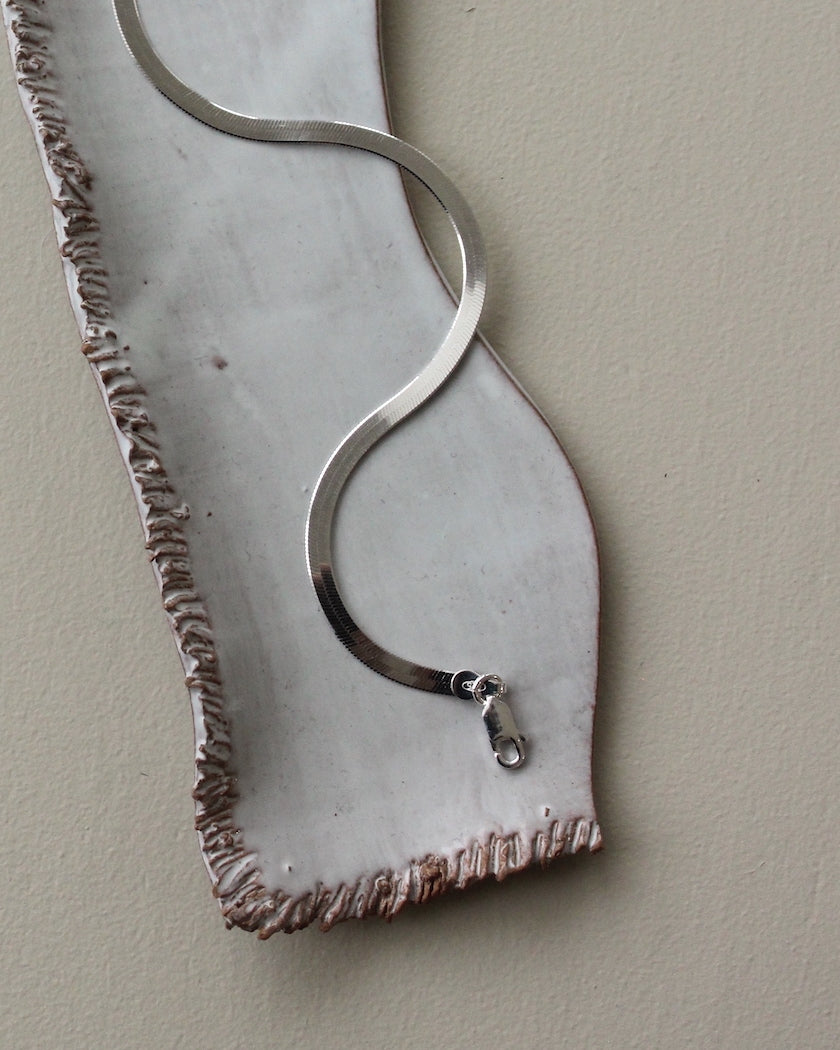 A sensual classic in a distinctly sinuous woven texture. This silver herringbone chain has a near mirror level shine that dazzles on the skin.