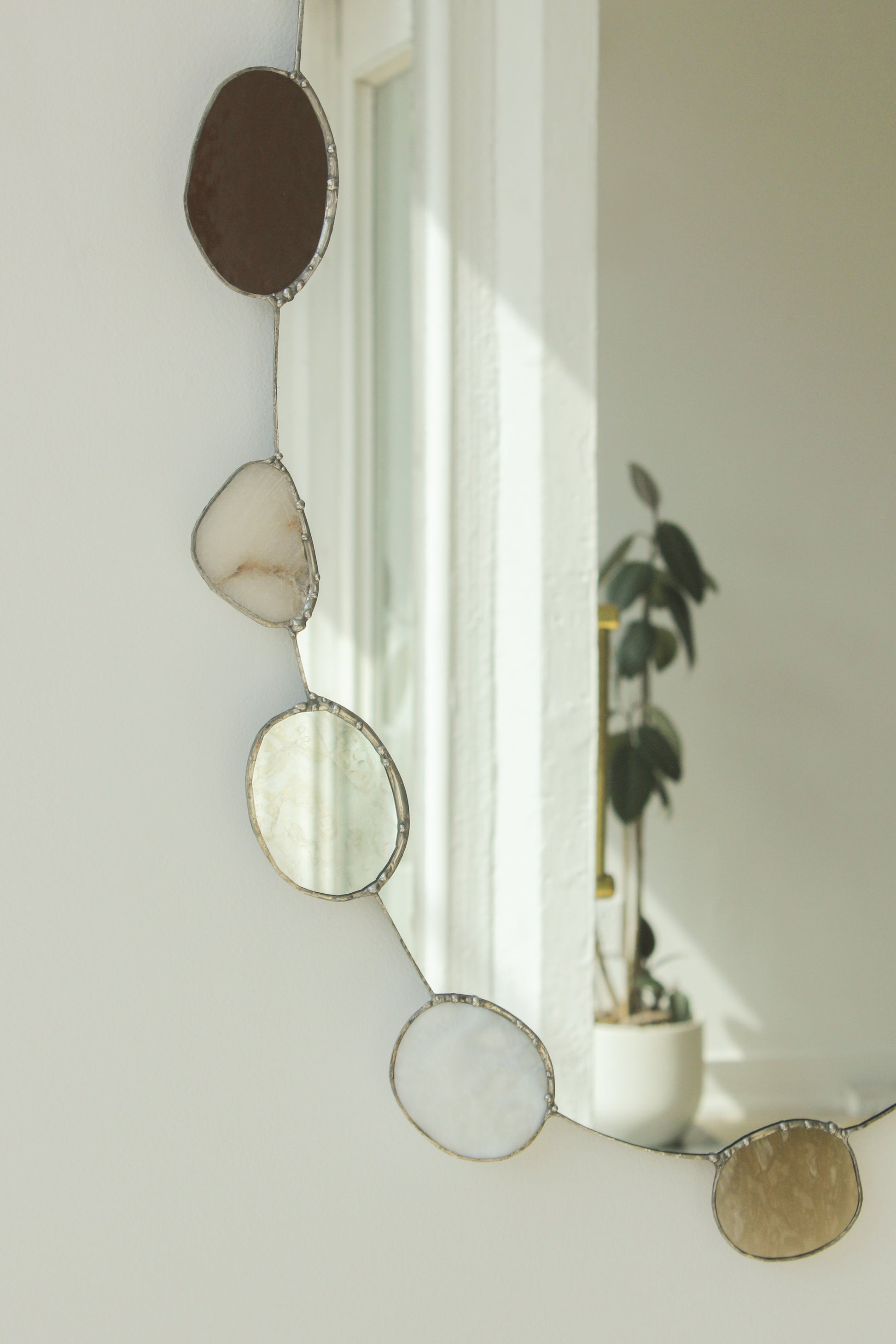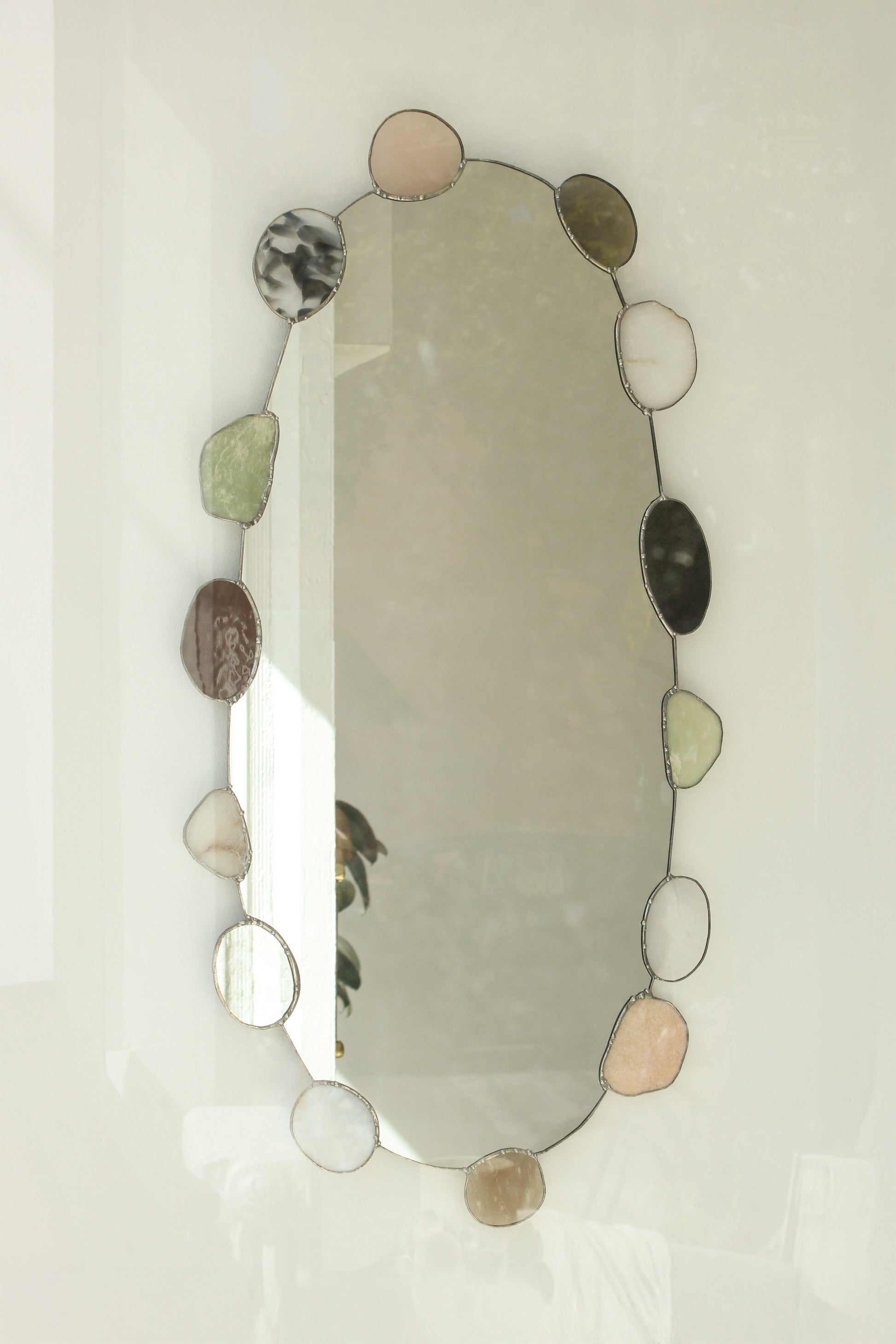 Hand cut, soldered + assembled. Aluminum french cleat hook included for hanging. Do not handle or hang the mirror by the pebbles. Solder contains traces of lead — please wash hands after handling.