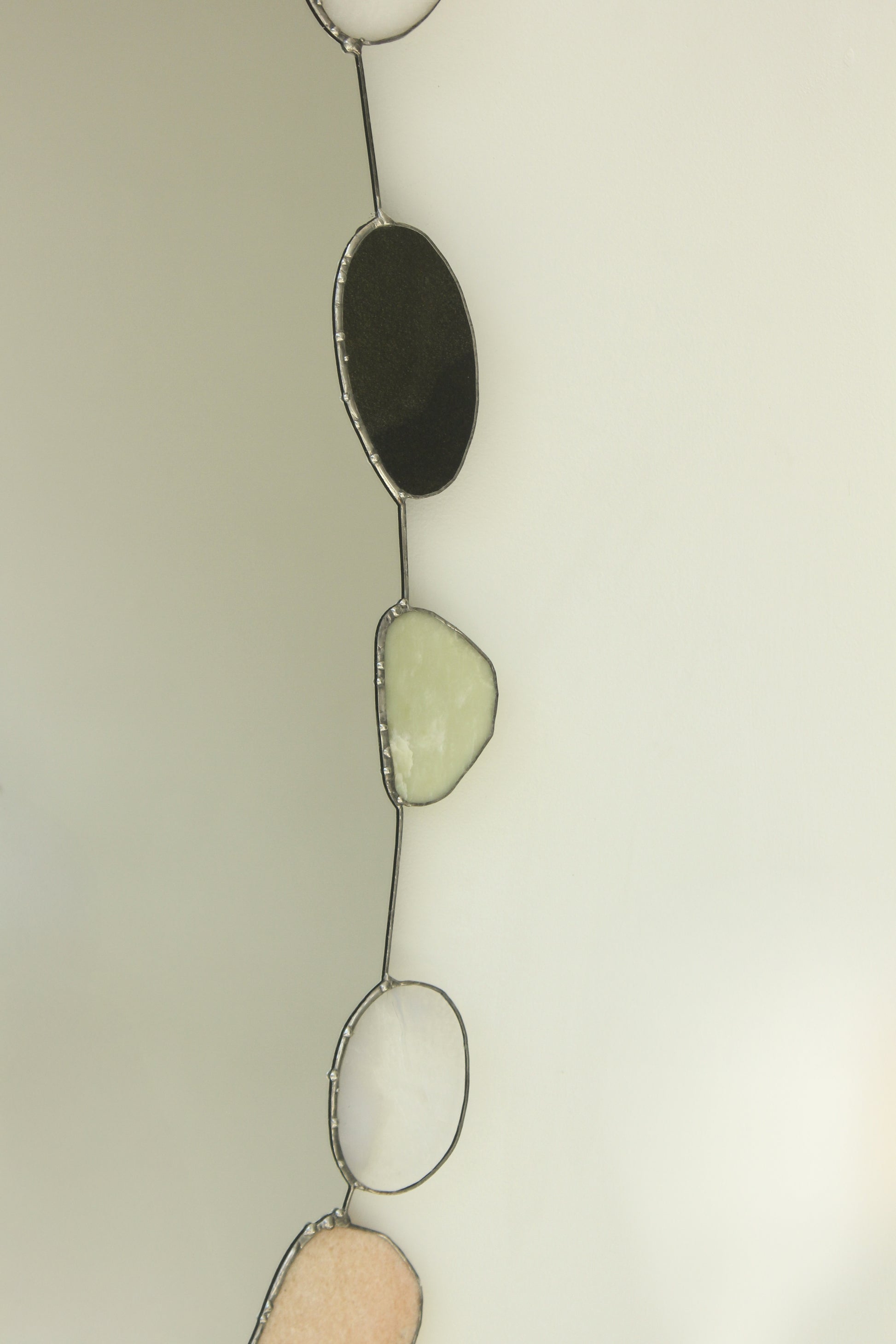 Hand cut stained glass and slices of natural stone pebbles in a sublimely coloured palette. A statement piece and size, part of our ongoing one-of-a-kind series with Ontario based artist Katie Kohls.